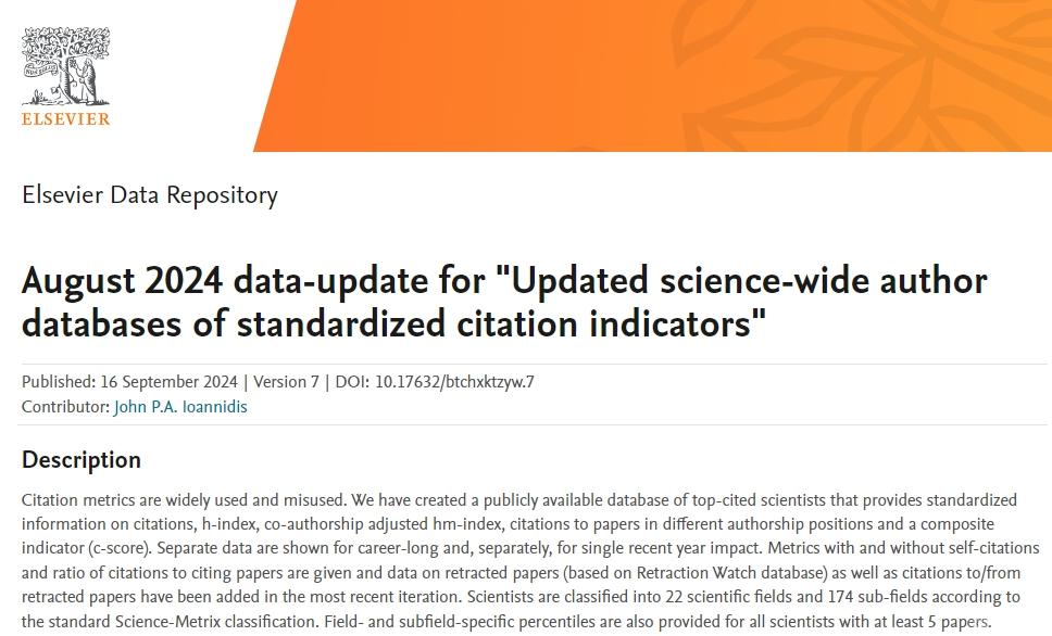 該榜單是斯坦福大學(xué)John P. A. Ioannidis教授團(tuán)隊(duì)與Elsevier的合作成果,榜單基于Scopus數(shù)據(jù)庫(kù)的引用數(shù)據(jù)系統(tǒng)分析,依據(jù)總引用量、Hirsch H-index、共同作者修正Schreiber Hm-index、單獨(dú)作者、單獨(dú)或者第一作者以及單獨(dú)、第一或者最后作者文章引用量等六種指標(biāo)進(jìn)行綜合評(píng)定,從近700萬名科學(xué)家中遴選出世界排名前2%的科學(xué)家,分為22個(gè)領(lǐng)域和174個(gè)細(xì)分子領(lǐng)域。榜單提供了面向科學(xué)家長(zhǎng)期科研表現(xiàn)的衡量指標(biāo),客觀真實(shí)反映科學(xué)家的學(xué)術(shù)影響力。