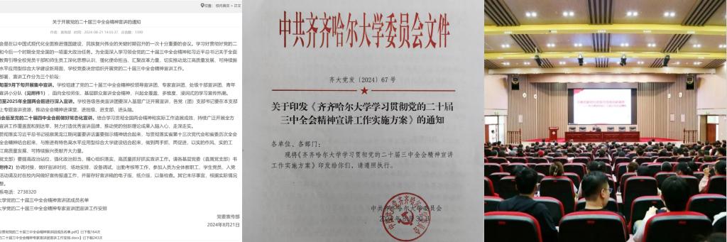 為深入貫徹習(xí)近平總書記關(guān)于宣講工作的重要指示,按照中央、省委、省委教育工委、市委關(guān)于學(xué)習(xí)貫徹黨的二十屆三中全會精神宣講工作有關(guān)要求,8月21日,學(xué)校召開了學(xué)習(xí)貫徹黨的二十屆三中全會精神宣講動員培訓(xùn)會,校黨委書記丁宏作動員講話,就扎實開展宣講工作提出明確要求并作專題培訓(xùn)。根據(jù)上級和學(xué)校黨委部署要求,黨委宣傳部第一時間組建了由校領(lǐng)導(dǎo)、處級干部、專家學(xué)者、青年學(xué)生和駐村干部等85人參與的“齊齊哈爾大學(xué)學(xué)習(xí)貫徹黨的二十屆三中全會精神宣講團(tuán)”,8月21日在校內(nèi)網(wǎng)發(fā)布了《關(guān)于開展黨的二十屆三中全會精神宣講的通知》,8月30日制定印發(fā)了《齊齊哈爾大學(xué)學(xué)習(xí)貫徹黨的二十屆三中全會精神宣講工作實施方案》,完善編發(fā)了《黨的二十屆三中全會精神宣講提綱》,邀請省委黨校專家作學(xué)習(xí)貫徹黨的二十屆三中全會精神專題輔導(dǎo),精心組織開展多次深入研討、集體備課,并結(jié)合實際開展不同層面宣講人員培訓(xùn),進(jìn)一步加深了對黨的二十屆三中全會精神的理解和把握,切實增強(qiáng)了宣講工作的針對性和實效性,確保宣講工作有序推進(jìn)、取得實效。