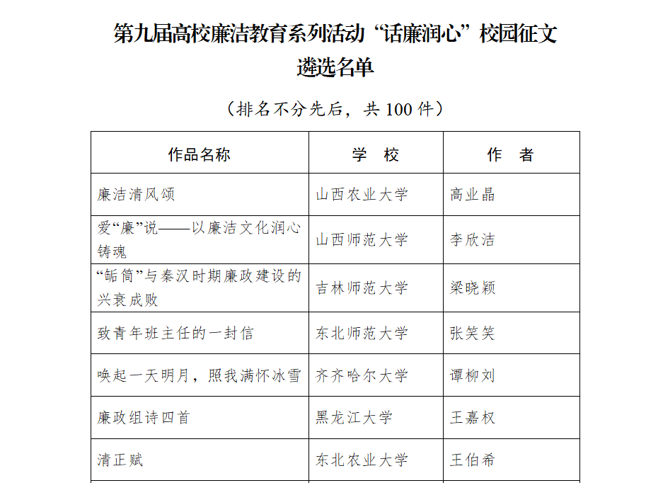 近日,教育部公布《關(guān)于第九屆高校廉潔教育系列活動(dòng)結(jié)果的公示》,我校馬克思主義學(xué)院譚柳劉同學(xué)的作品成功入選“話廉潤心”校園征文教育部遴選名單。這是繼2023年我校馬克思主義學(xué)院徐光迪同學(xué)的作品《大雨》獲教育部第八屆高校廉潔教育系列活動(dòng)“廉心文語”校園征文優(yōu)秀作品獎(jiǎng)之后的又一榮譽(yù)。