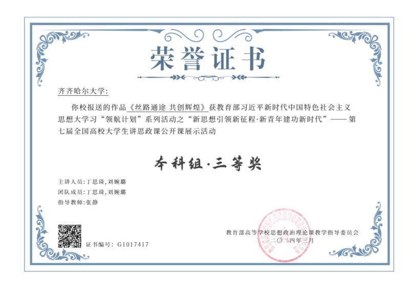 近日,由教育部高校思政課教學(xué)指導(dǎo)委員會(huì)主辦,南開大學(xué)馬克思主義學(xué)院承辦的“新思想引領(lǐng)新征程?新青年建功新時(shí)代”——第七屆全國高校大學(xué)生講思政課公開課展示活動(dòng)公布了評(píng)審結(jié)果。我校馬克思主義學(xué)院張靜教授指導(dǎo)的學(xué)生參賽作品《絲路通途 共創(chuàng)輝煌》榮獲本科組三等獎(jiǎng)。