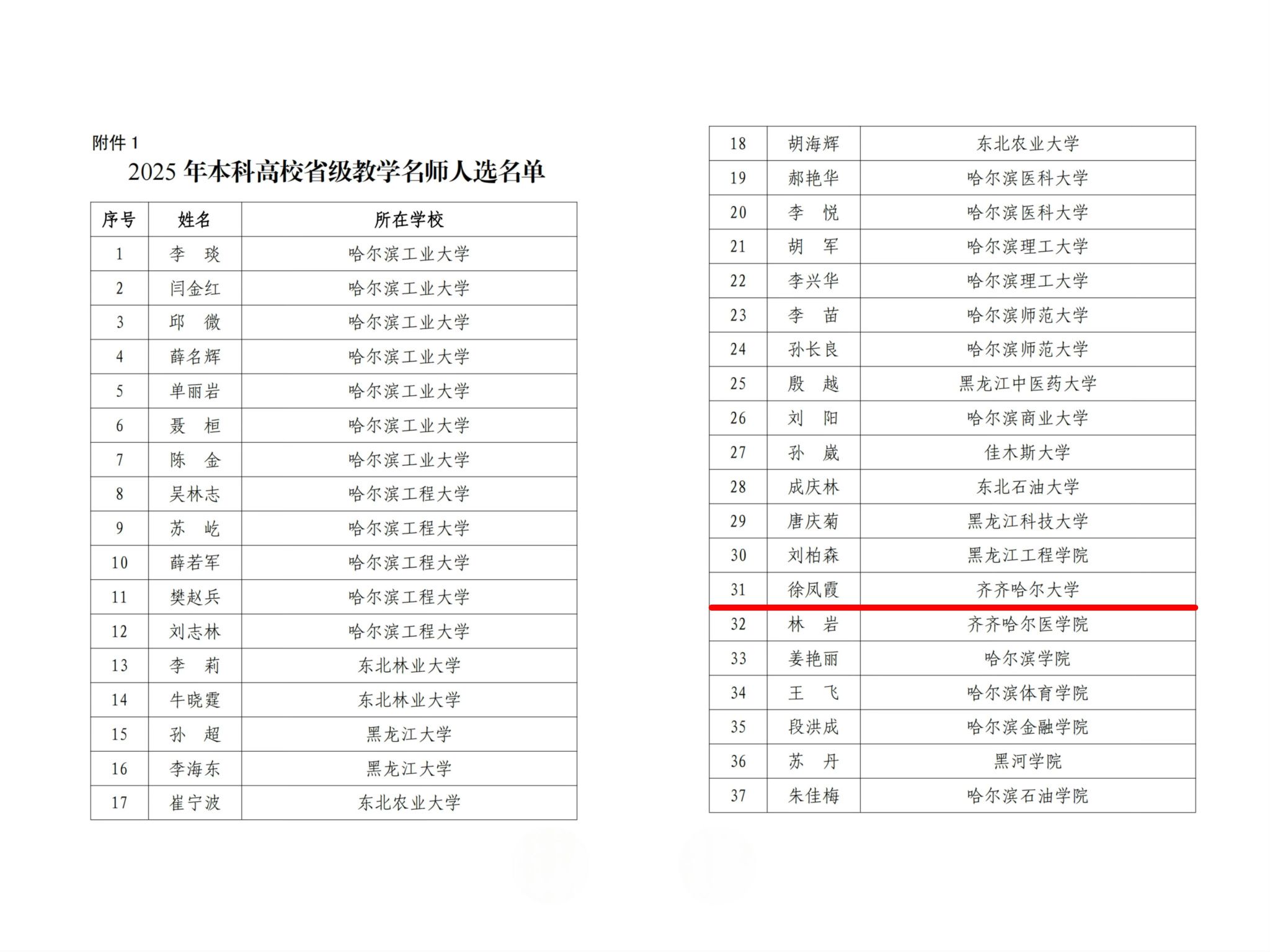 近期,黑龍江省教育廳發(fā)布了《關(guān)于公布2025 年黑龍江省級教學(xué)名師的通知》(黑教發(fā)〔2025〕31號),我校教師徐鳳霞教授獲評2025年黑龍江省本科高校省級教學(xué)名師。本次“省級教學(xué)名師”榮譽的獲得,是我校在師資隊伍建設(shè)、教育教學(xué)水平建設(shè)方面取得的又一重要成果。