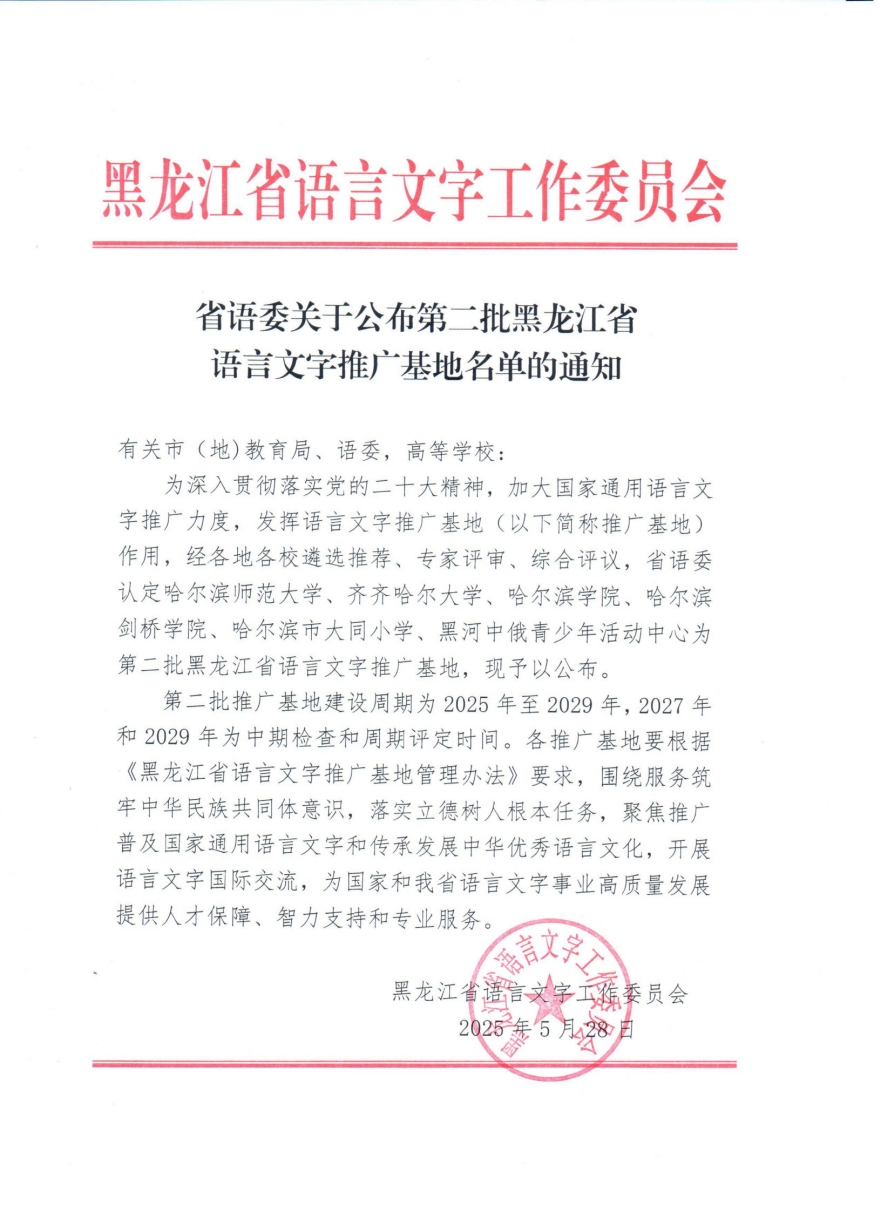 近期,黑龍江省語言文字工作委員會發(fā)布了《省語委關于公布第二批黑龍江省語言文字推廣基地名單的通知》,我校被省語委認定為黑龍江省第二批語言文字推廣基地。此次省級基地的獲批,是我校在基地建設方面取得的又一重要成果。