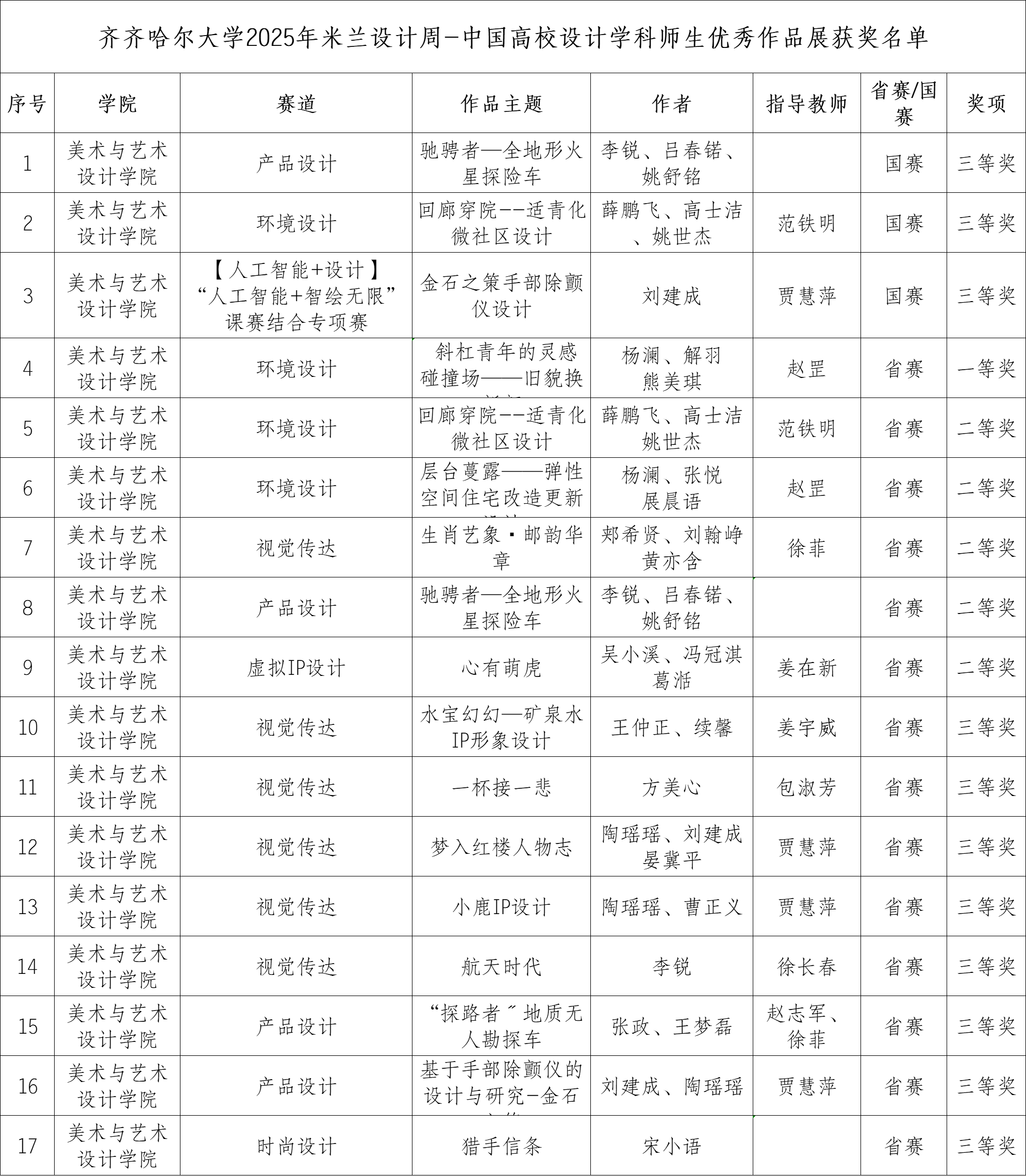 本次大賽取得的成績(jī)彰顯了我校“教賽融合、產(chǎn)教協(xié)同”的辦學(xué)特色,是對(duì)設(shè)計(jì)學(xué)科教學(xué)質(zhì)量與人才培養(yǎng)成效的充分肯定,也是學(xué)校深化教學(xué)改革、優(yōu)化學(xué)科建設(shè)、精準(zhǔn)對(duì)接我省“4567”現(xiàn)代產(chǎn)業(yè)體系中創(chuàng)意設(shè)計(jì)產(chǎn)業(yè)人才需求的成果體現(xiàn)。未來(lái),學(xué)校將持續(xù)優(yōu)化創(chuàng)新型設(shè)計(jì)人才培養(yǎng)體系,為龍江振興提供堅(jiān)實(shí)人才支撐。