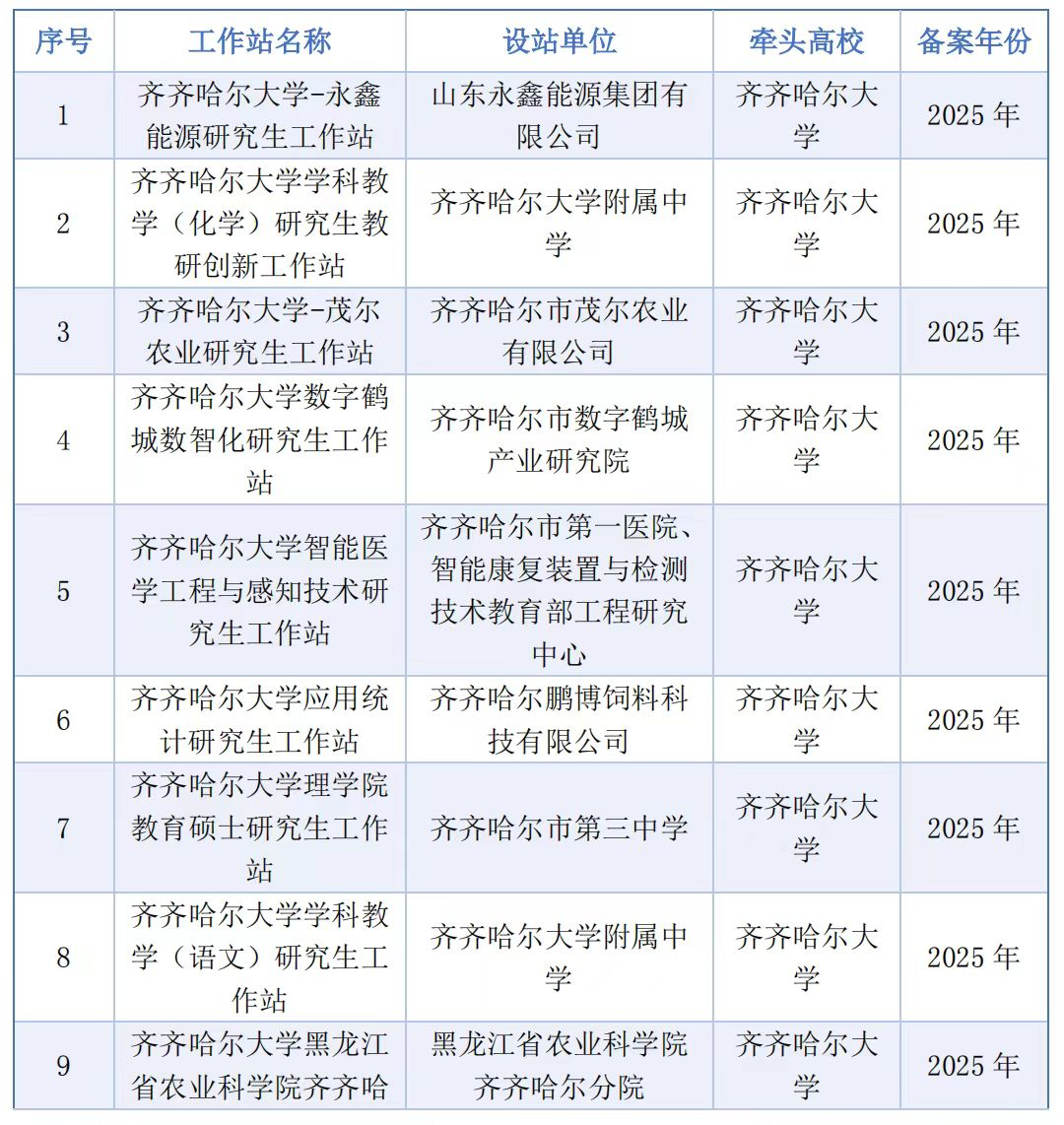 近日,黑龍江省教育廳公布了2025年度黑龍江省產(chǎn)教融合研究生工作站備案名單,我校申報的“齊齊哈爾大學(xué)數(shù)字鶴城數(shù)智化研究生工作站”等24個工作站成功獲批。截至目前,我校省級產(chǎn)教融合研究生工作站總量已達49個。