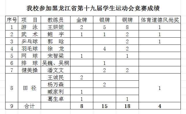 7月15日至25日,黑龍江省第十九屆學生運動會在大慶市舉行。本屆運動會設高校組、地市組兩大板塊,我校選派100名師生組成代表團,在游泳、武術、乒乓球、羽毛球、網(wǎng)球、排球、健美操、田徑八個項目中展開激烈角逐。經(jīng)過十天激烈比拼,我校運動員憑借出色發(fā)揮和頑強拼搏,最終獲得8金、15銀、18銅,總計41枚獎牌,大學乙組團體總分第三名的優(yōu)異戰(zhàn)績。