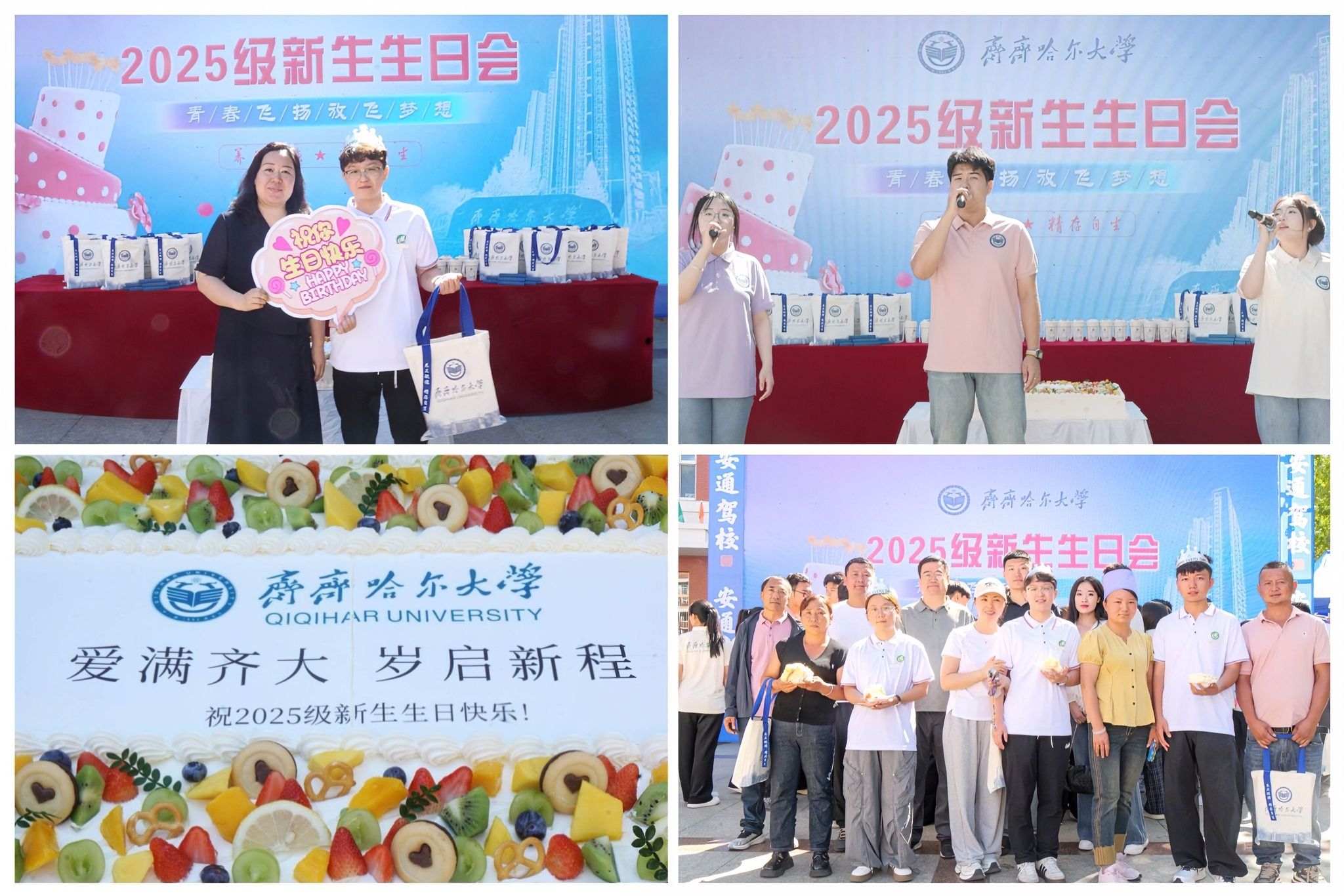 活動現(xiàn)場,校園十佳歌手以溫暖的歌聲為“小壽星”們送上真摯的祝福。各學院領導老師滿懷關愛地為新生壽星送上祝福與禮物,暖意融融的互動為同學們注入了融入齊大的第一股暖流。學校特別定制的長1米、寬0.5米的大型生日蛋糕,“愛滿齊大、歲啟新程”傳遞出學校對新生的真摯關愛,也寄托了對他們嶄新旅程的美好祝愿。