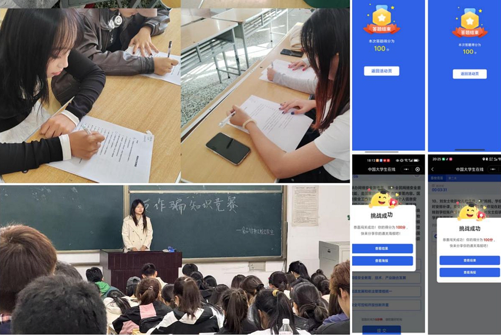 宣傳周期間,學校組織師生通過中國大學生在線參與網(wǎng)絡(luò)安全知識答題活動,普及防詐騙、防非法校園貸等知識。計算機與控制工程學院、食品與生物工程學院等單位還組織開展網(wǎng)絡(luò)安全知識競賽,涵蓋法規(guī)、案例應急處置等內(nèi)容,以賽促學;文學與歷史文化學院(新聞傳播學院)、外國語學院等單位開展創(chuàng)意作品征集,收到微視頻、宣傳海報、手抄報等作品,以視覺化形式闡釋網(wǎng)絡(luò)安全重要性。