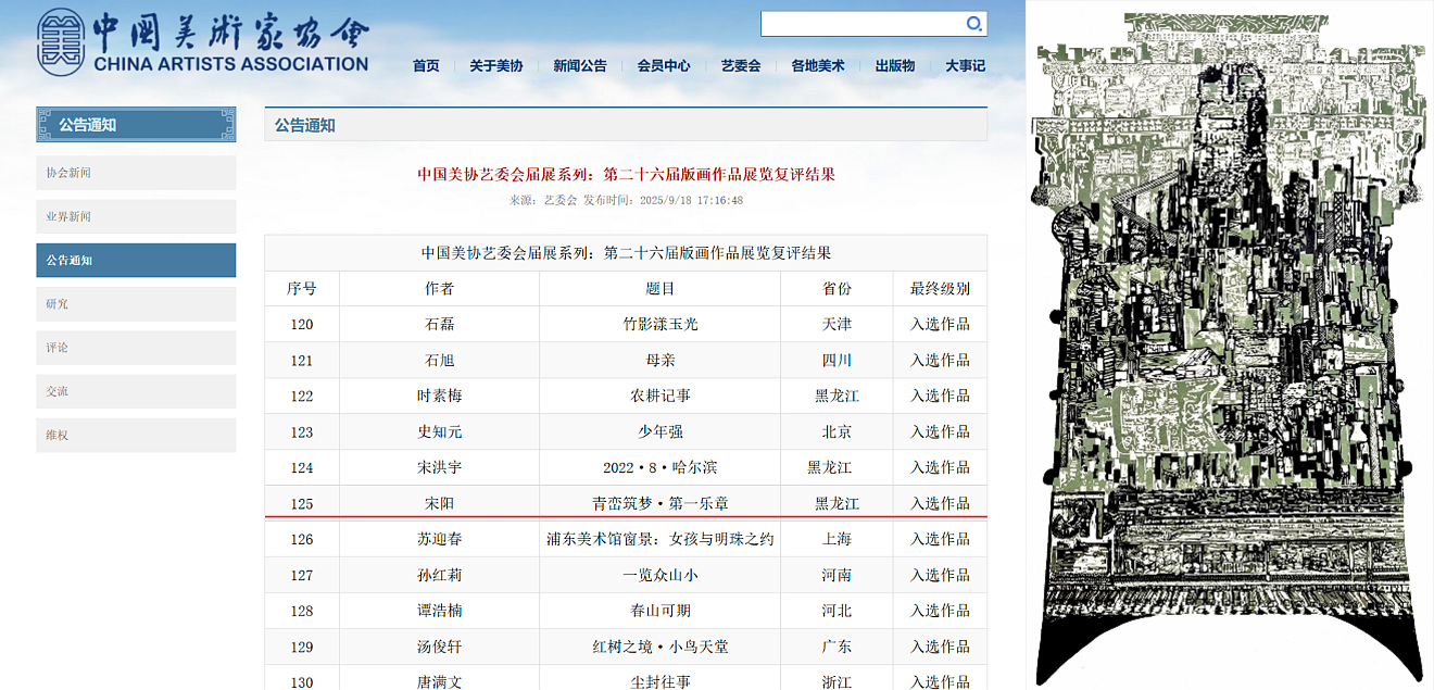 全國版畫作品展覽由中國美術(shù)家協(xié)會主辦,每兩年舉辦一次,是國內(nèi)版畫藝術(shù)領(lǐng)域最具權(quán)威性和影響力的版畫展覽。本屆展覽堅持“學(xué)術(shù)性、思想性與藝術(shù)性并重”的評審原則,最終遴選出228件精品力作。我省共有17件作品入選,宋陽老師的作品位列其中,這也是宋陽繼2024年入選第十四屆全國美術(shù)作品展覽之后獲得的又一重要獎項。