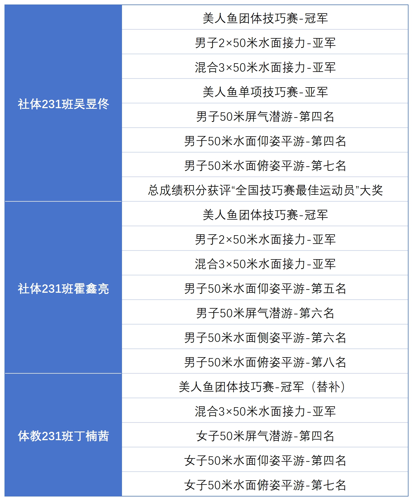 此次佳績的取得,得益于學(xué)校與體育學(xué)院的全面支持、教師的專業(yè)指導(dǎo)以及隊員的刻苦訓(xùn)練。備賽期間,由體育學(xué)院張津銘老師全程指導(dǎo),依托“專業(yè)課程+賽事實踐”融合模式,為三位選手制定針對性訓(xùn)練方案。張津銘老師兼任教練與領(lǐng)隊,是中國首批國家美人魚教練、美人魚水下技術(shù)裁判及國際潛水教練訓(xùn)練官,具備多項專業(yè)資質(zhì)。比賽中,三位選手展現(xiàn)出良好的專業(yè)素養(yǎng)與穩(wěn)定的臨場發(fā)揮,在面對包括世錦賽世界冠軍、世界紀錄保持者及各高校、體育類專業(yè)院校代表隊在內(nèi)的強隊時沉著應(yīng)戰(zhàn),在個人與團體項目中均取得優(yōu)異成績。