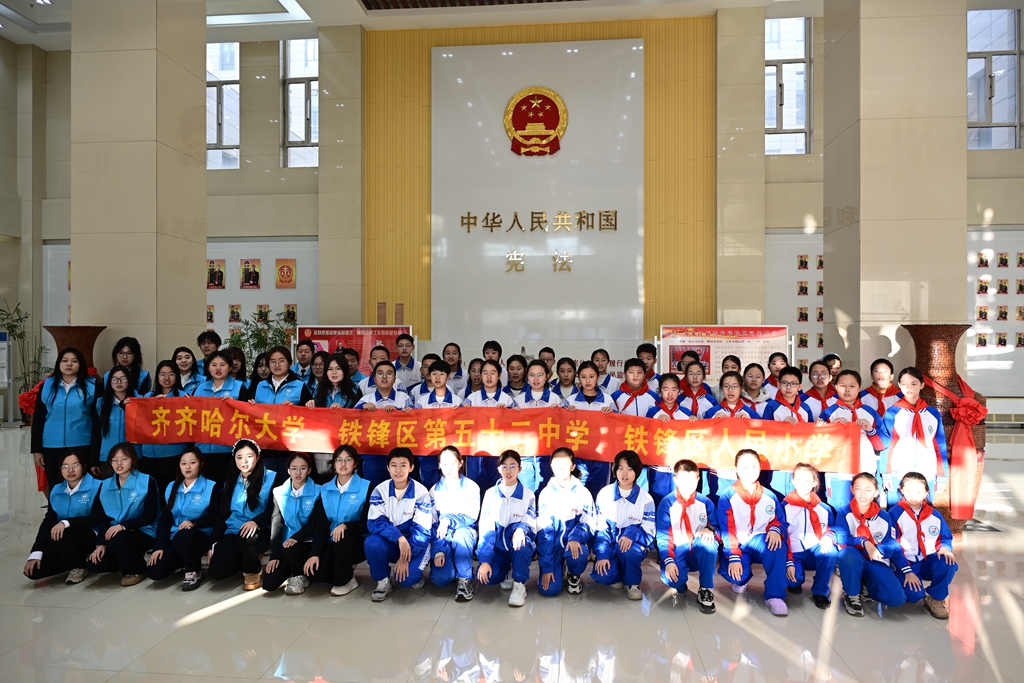 為迎接第十二個國家憲法日,大力弘揚(yáng)憲法精神,深化大中小學(xué)法治教育一體化建設(shè),12月3日下午,我校學(xué)生代表和鐵鋒區(qū)第五十二中學(xué)校、鐵鋒區(qū)人民小學(xué)校的學(xué)生代表一同走進(jìn)齊齊哈爾市中級人民法院,開展“跨齡同行學(xué)憲法 法治護(hù)航青春路”主題普法宣傳活動,通過“行走的法治課堂”開啟沉浸式普法體驗。校黨委常委、宣傳部部長杜海權(quán)及宣傳部相關(guān)工作人員、相關(guān)學(xué)院教師參加活動。
