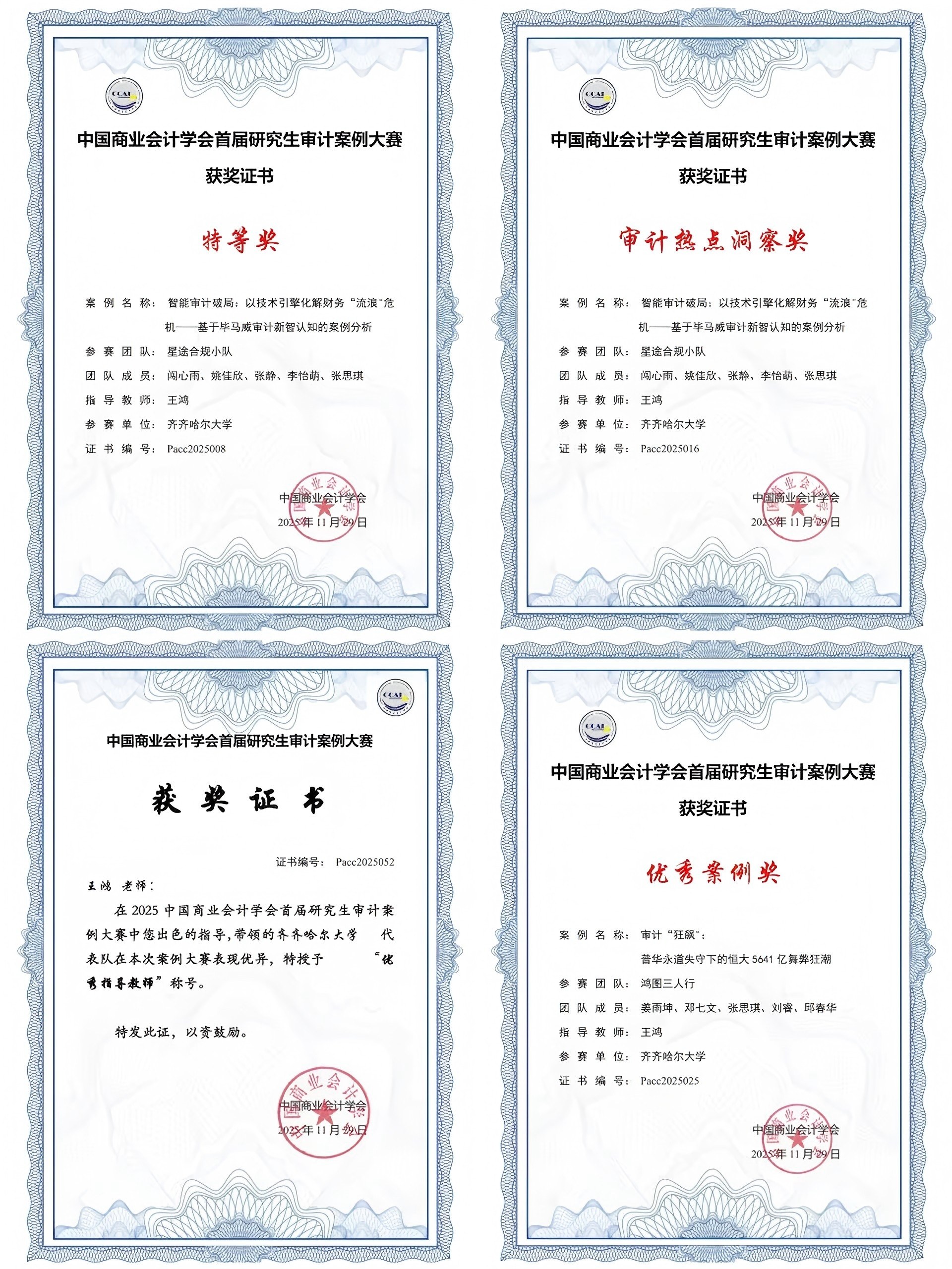 11月29日,中國商業(yè)會計學(xué)會首屆研究生審計案例大賽決賽在哈爾濱商業(yè)大學(xué)順利收官。由我校經(jīng)濟與管理學(xué)院王鴻教授指導(dǎo)的“星途合規(guī)小隊”,憑借案例《智能審計破局:以技術(shù)引擎化解財務(wù)“流浪”危機——基于畢馬威審計新智認知的案例分析》,從全國眾多高校的參賽隊伍中脫穎而出,獲得第一名,成功斬獲大賽“特等獎”。該團隊同時獲得“審計熱點洞察獎”、王鴻教授獲“優(yōu)秀指導(dǎo)教師獎”,我校另一個參賽團隊獲得“優(yōu)秀案例獎”,彰顯了我校會計碩士培養(yǎng)的扎實功底與創(chuàng)新活力。
