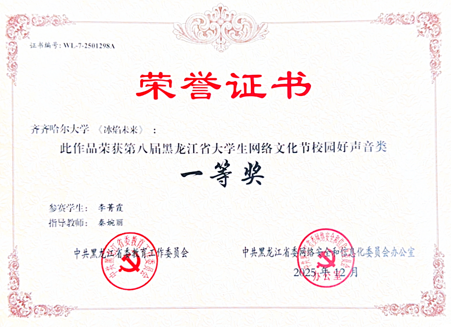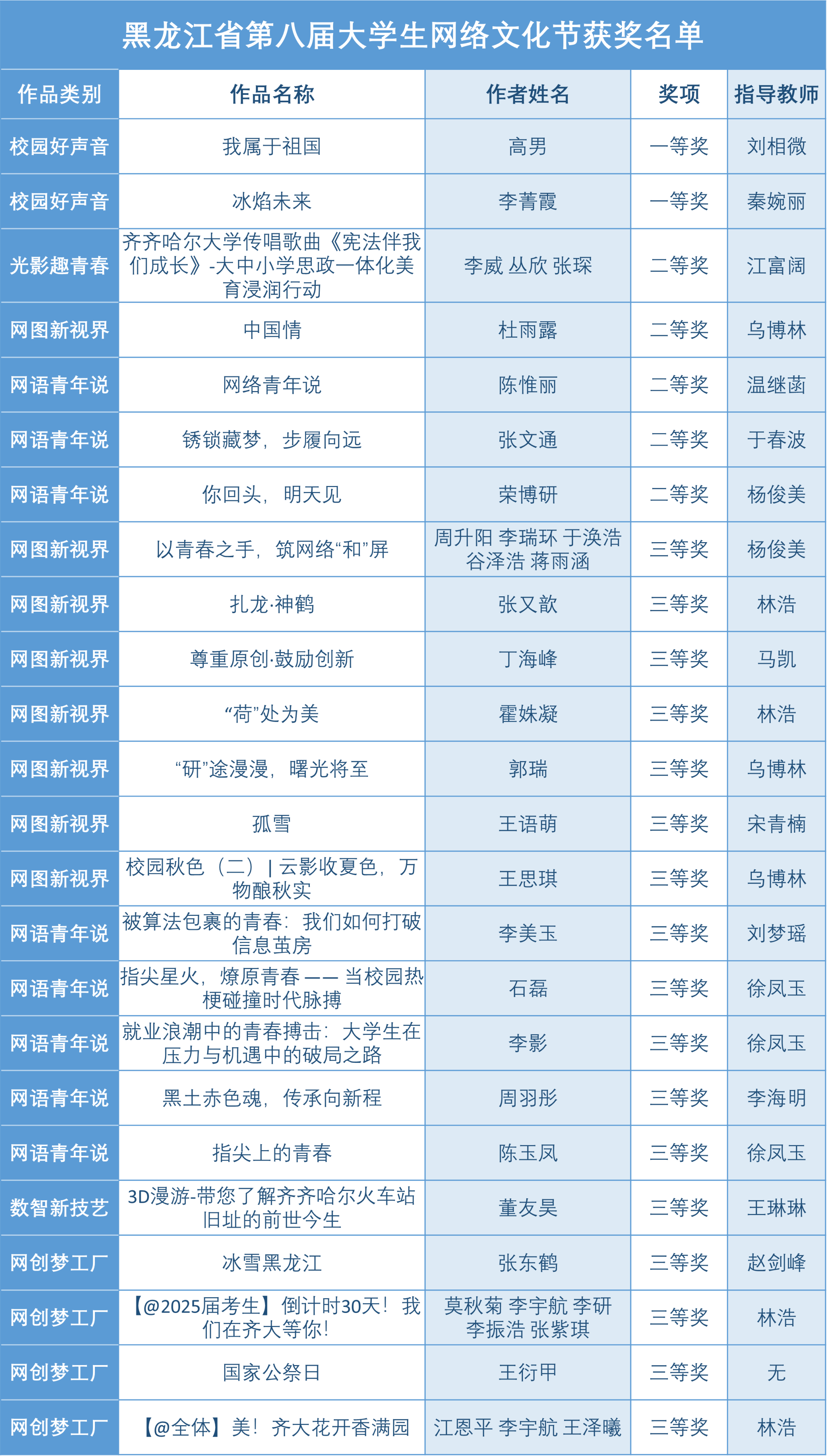 近日,由省委教育工委、省委網(wǎng)信辦聯(lián)合舉辦的“第八屆黑龍江省大學(xué)生網(wǎng)絡(luò)文化節(jié)”評(píng)選結(jié)果揭曉,我校推薦的24項(xiàng)作品斬獲佳績(jī),獲獎(jiǎng)作品均被推薦參加第八屆全國(guó)大學(xué)生網(wǎng)絡(luò)文化節(jié)評(píng)選。