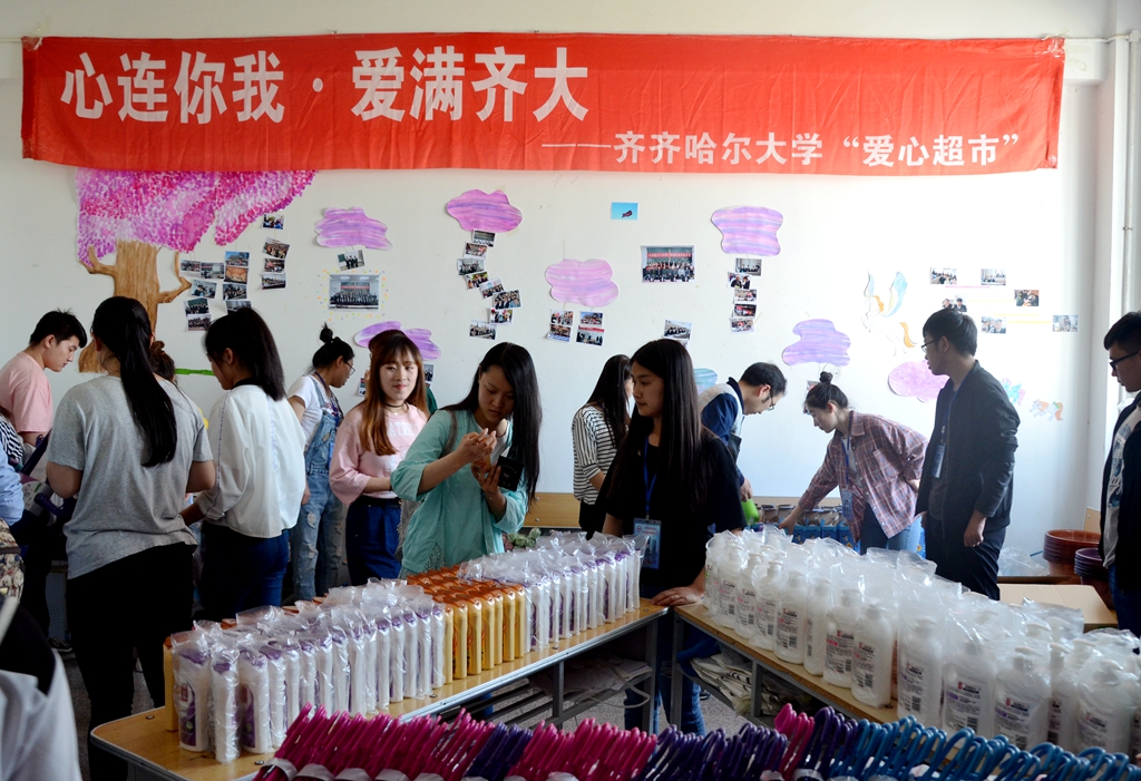 齊齊哈爾大學(xué)“愛(ài)心超市”是一種“以捐助為主渠道,以超市運(yùn)作為載體”的長(zhǎng)期公益性活動(dòng),愛(ài)心超市由校勤工助學(xué)服務(wù)中心負(fù)責(zé)日常管理。通過(guò)愛(ài)心超市將全校師生和社會(huì)各界愛(ài)心人士捐贈(zèng)的衣物及文體、生活用品免費(fèi)發(fā)放給我校家庭經(jīng)濟(jì)困難學(xué)生,緩解這些學(xué)生的經(jīng)濟(jì)壓力。自2013年學(xué)校成立“愛(ài)心超市”以來(lái),它已經(jīng)陪伴同學(xué)們走到了第五個(gè)年頭,受惠的同學(xué)數(shù)以萬(wàn)計(jì),“愛(ài)心超市”的知名度也越來(lái)越高,得到社會(huì)各界和全校師生的廣泛贊譽(yù)。