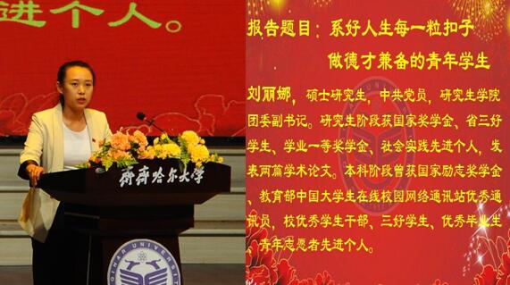 報(bào)告團(tuán)成員建筑與土木工程學(xué)院聶寶琦、研究生學(xué)院劉麗娜、材料科學(xué)與工程學(xué)院姜英宇、經(jīng)濟(jì)與管理學(xué)院邊羽、輕工與紡織學(xué)院孫陵共五名同學(xué)與大家分享了他們的成長(zhǎng)經(jīng)歷。