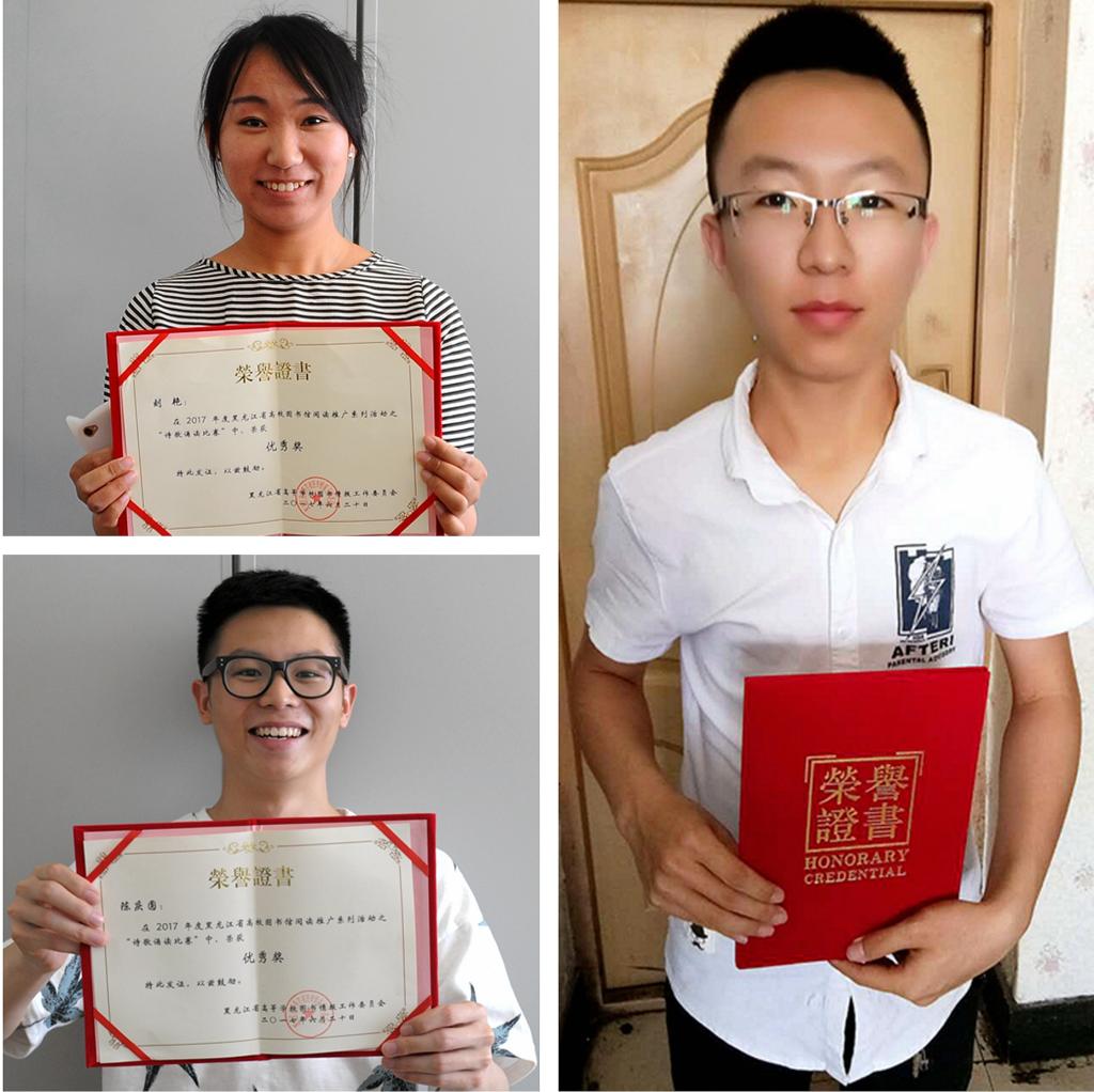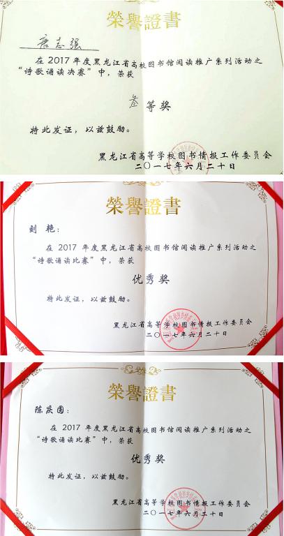 參賽選手聲情并茂,飽含對閱讀的喜愛和對詩歌的敬仰,深刻解讀名家作品,深情演繹詩歌意境,使觀眾身臨其境地感受讀書的魅力、文字的優(yōu)美、書香的陶醉、文化的盛宴。經(jīng)過激烈角逐,我校唐志強同學在“詩歌誦讀比賽”中榮獲三等獎,劉艷同學和陳慶圓同學在“詩歌誦讀比賽”中榮獲優(yōu)秀獎。