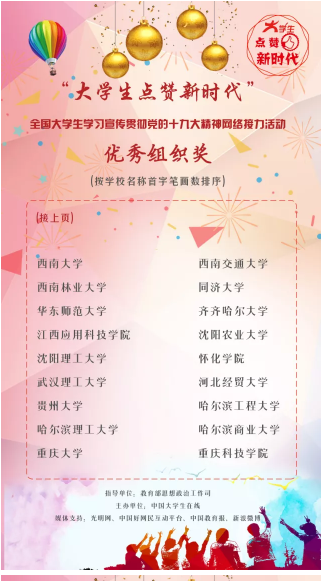 近日,由教育部思想政治工作司指導,中國大學生在線主辦的“大學生點贊新時代”全國大學生學習宣傳貫徹黨的十九大精神網(wǎng)絡接力活動已經(jīng)圓滿收官,我校在此次活動中獲得優(yōu)秀組織獎。