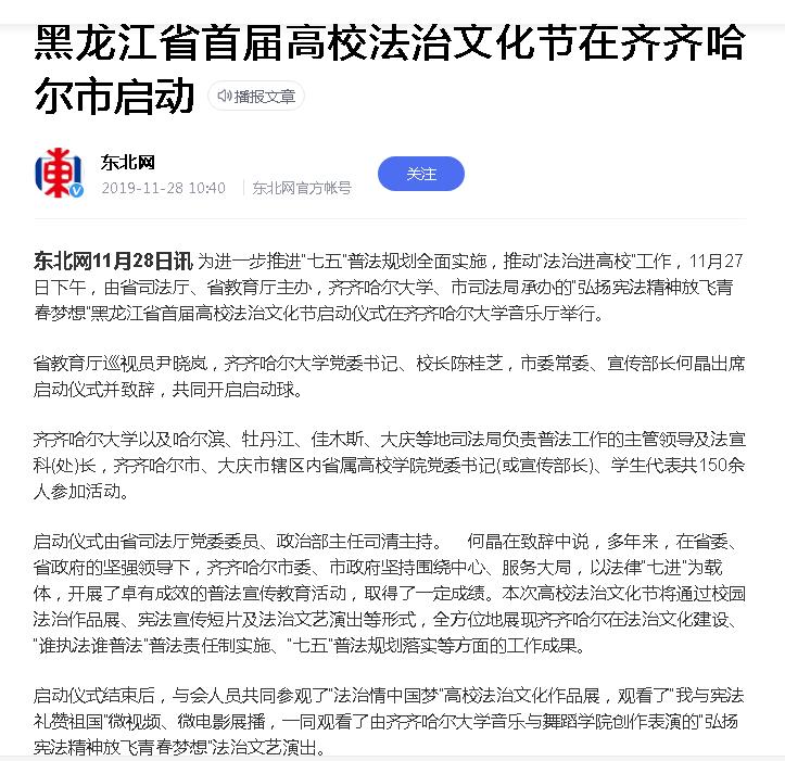 上一條:【東北網(wǎng)】黑龍江省首屆高校法治文化節(jié)在齊齊哈爾市啟動(dòng)
