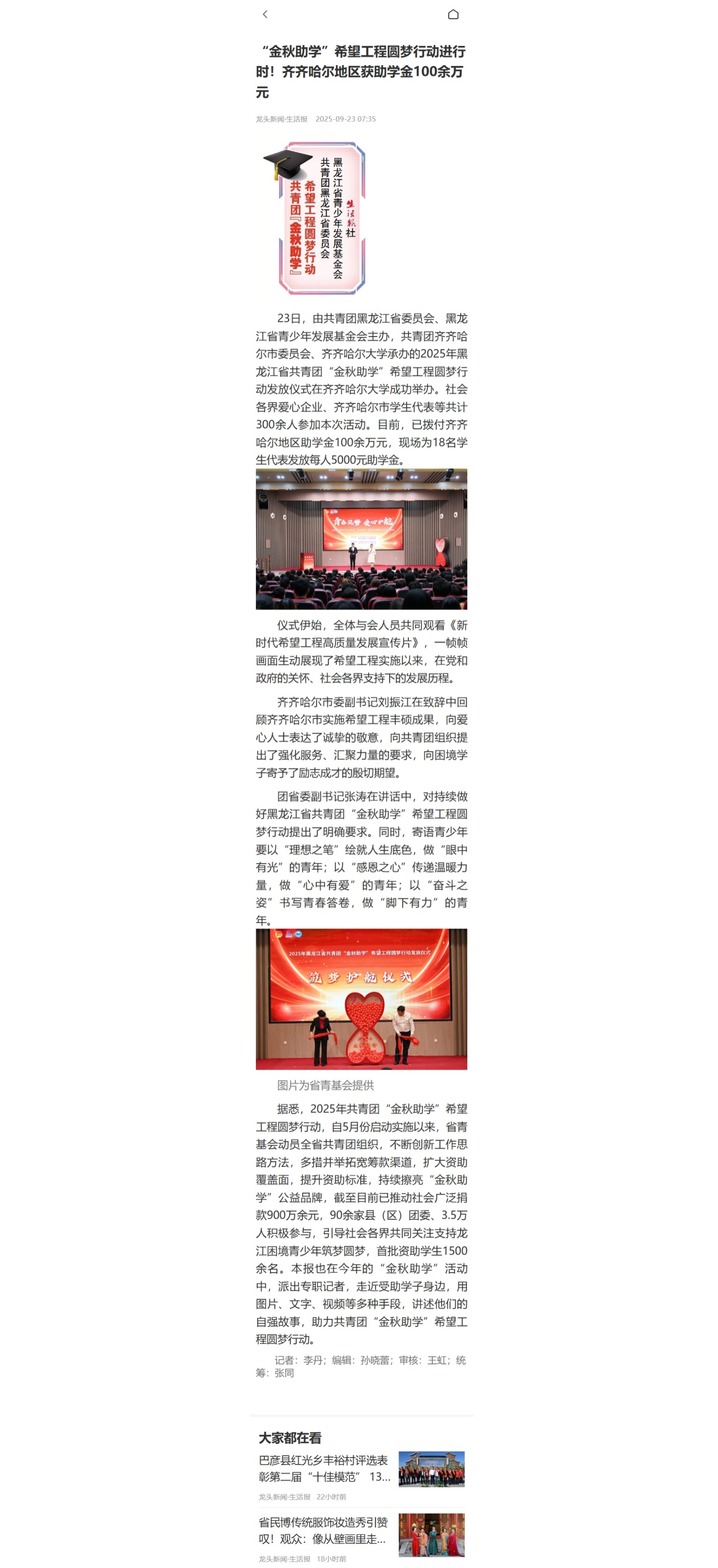 上一條:【黑龍江日報(bào)】“金秋助學(xué)”希望工程圓夢行動(dòng)舉行助學(xué)金發(fā)放儀式