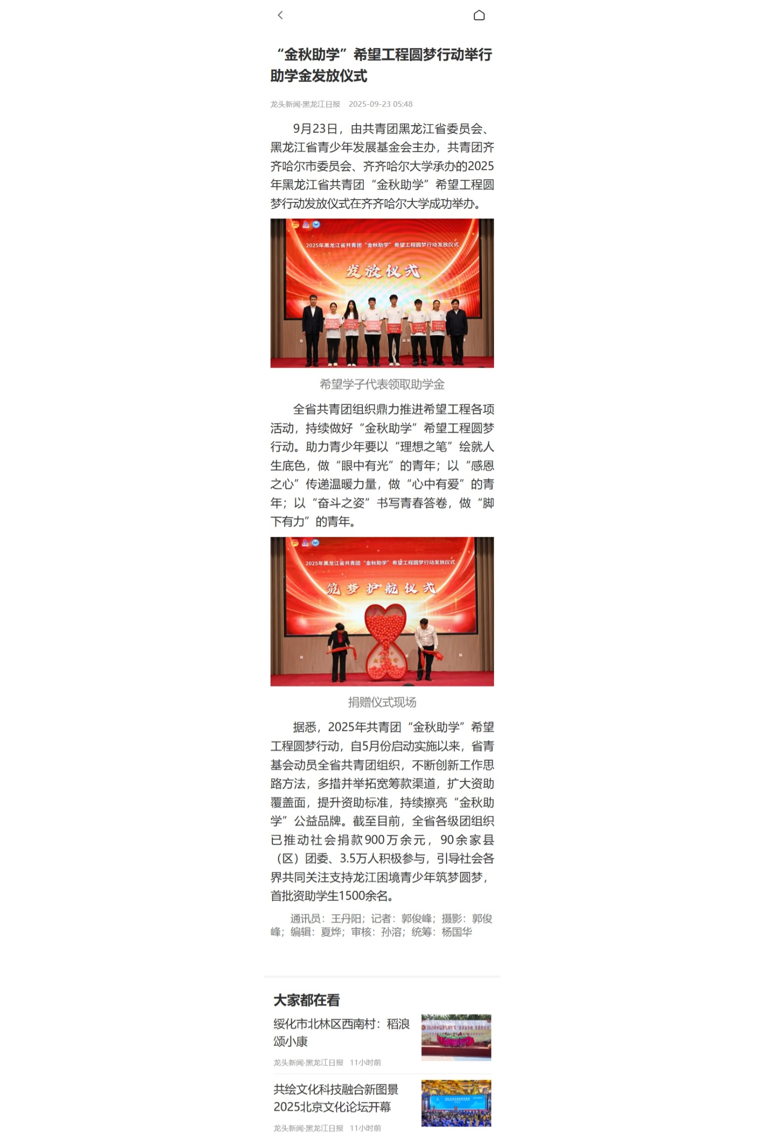 下一條:【龍頭新聞】“金秋助學”希望工程圓夢行動進行時!齊齊哈爾地區(qū)獲助學金100余萬元